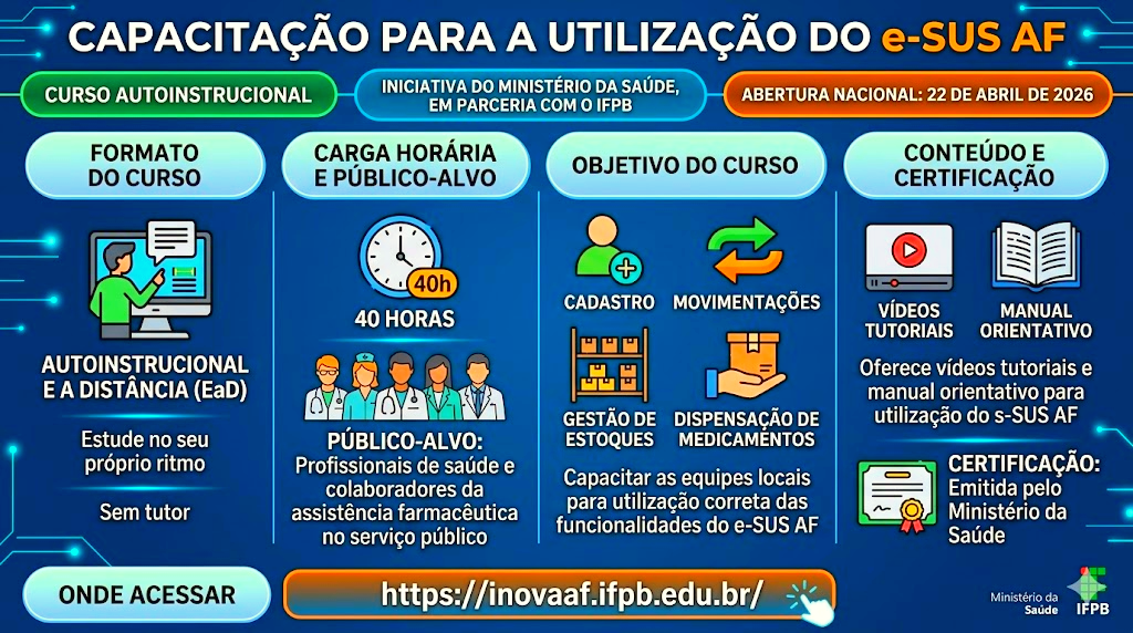 O curso autoinstrucional de "Capacitação para a Utilização do e-SUS AF" é uma iniciativa do Ministério da Saúde, em parceria com o IFPB, voltada para profissionais de saúde e colaboradores da assistência farmacêutica no serviço público.